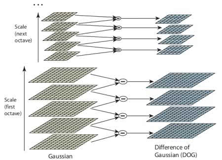 Laplacian of Gaussian is often impractical because it is inefficient. Therefore SIFT uses Difference of Gaussians, which is calculated as the difference of blurred images with different σ values(σ and kσ). This process occurs on all levels of the Gaussian pyramid as shown in figure 1 below.